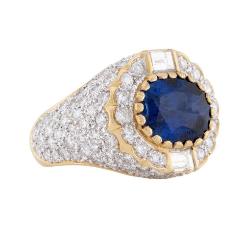 A spectacular sapphire and diamond cocktail ring! This gorgeous ring is crafted in vibrant yellow gold, and features a central 5.25ct oval cut sapphire. The sapphire is wonderfully faceted, displays a deep, rich blue hue, and is held within a scalloped prong-setting. The top and bottom of the sapphire each feature a single baguette cut diamond, which is held in place by a two-prong setting. Both the left and right of the sapphire feature seven modern round brilliant cut diamonds, which rest within bead-settings. The shoulders of the ring are encrusted with modern round brilliant cut diamonds, which are all pavé-set. Together, all of the diamonds have an approximate total carat weight of 3ctw. The remainder of the band is smooth and simple, and the inside of the shank features an “18K” purity mark. An absolutely beautiful statement ring, it would make an incredible gemstone engagement ring!