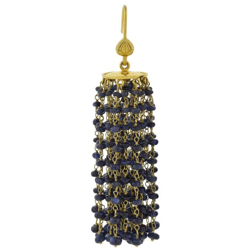 A fabulous pair of Estate beaded sapphire tassel earrings! Crafted in 18kt yellow gold, each of these stylish earrings features a beveled gold disc which hangs from a simple earring wire. Attached on the underside of the discs are 27 strands of gold chain and a total of 243 sapphire beads on each earring. The sapphire beads display a deep blue hue, glistening with every movement, and beautifully framing the face. The earrings look lovely on and would be a wonderful addition to any fashion-forward collection.