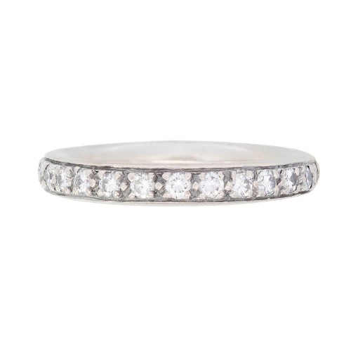 A stunning diamond eternity band! Crafted in platinum, this stunning band features a row of 14 full cut diamonds, held within bead settings. Overall, the diamonds have an approximate total carat weight of .35ctw. The remainder of the band is smooth and simple. An elegant and timeless piece, this eternity band would make a lovely everyday piece or anniversary gift!