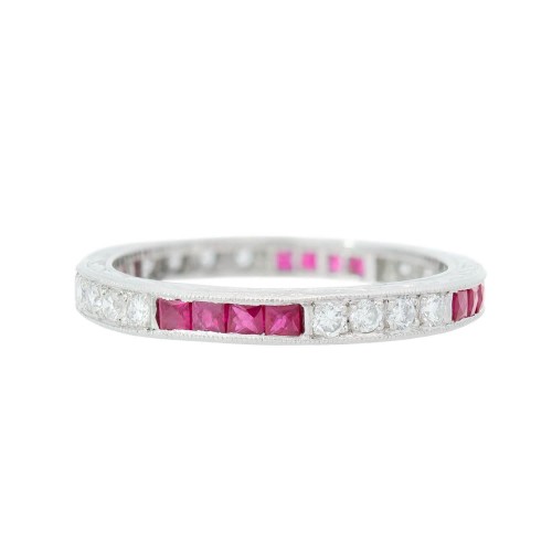 An absolutely gorgeous Estate diamond and ruby eternity band! Made of platinum, this feminine band is comprised of a pattern of four full cut diamonds and four french cut rubies, held within a channel setting. The alternating design carries around the entire surface of the ring and the contrast between the sparkling diamonds and vivid red rubies is simply superb. Intricate etchings decorate the top and bottom of the band. The simple, yet stunning design would look wonderful worn alone or stacked with other bands. It’s beautiful eternity band that would make an exquisite wedding band or anniversary piece!