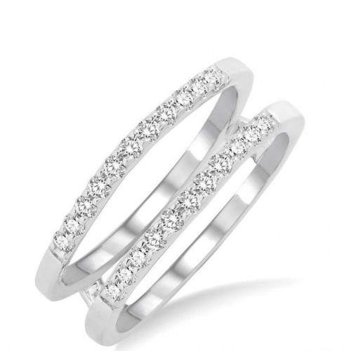 A majestic diamond insert ring, this can add glamor to even the simplest of rings worn with it. The ring features a gorgeous Fleur De Lis on the opposite centers facing each other. A tiny oval shape mount flanks the lily on either side, while joining the shank from the other side. 8 prong set round cut diamonds each, a total of 16, embellish both the Fleur De Lis accents, while a bezel set round cut diamond each adorns the 4 oval mounts. 24 prong set round cut diamonds, 6 each on all 4 sides, decorate the shank. A milgrain finish is offered to all the features. The insert ring is molded in 14 karat white gold. Total diamond weight is 1/4 ctw.