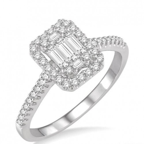 Sleek and stylish, this fusion diamond fashion ring is a must-have in one’s jewelry box. The slim tiered center mount and complementing shank, give the ring a gorgeous look. Seen in the centerpiece is a raised rectangular center mount, flanked by a thin rectangular mount each, placed at a lower level than the center mount. Embellishing the center mount is 3 invisible set baguette cut diamonds, lying vertically in the center, with a small baguette cut diamond each at the top and bottom of the center baguette. An invisible set round cut diamond each, total 4, fills the corners of the mount, flanking the small baguettes. On the lower mounts is encrusted a prong taper set baguette cut diamond each. 9 each, total 18, micro wall set round cut diamonds decorate the shank on either side. The fashion ring is styled in 14 karat yellow and white gold. Total diamond weight is 5/8 ctw.