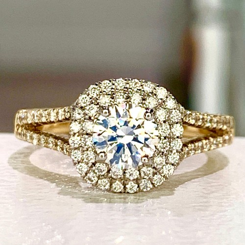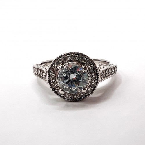 The Gabriel “Pamina” 14K white gold round halo engagement ring features a unique beaded shank that adds subtle texture and charm. A circular halo of 0.22 carats of pavé diamonds perfectly enhances your chosen round cut center stone, combining modern design with timeless elegance.