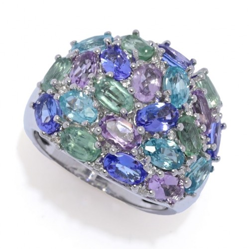 Adorned with a captivating array of stones, this ring features:
