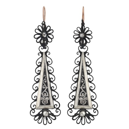 The complimentary earrings display a fabulous dangling design and feature an elongated triangular-shaped mirrored plaque hanging from a gorgeous ironwork topper. The surface is graced with a swirled vine motif that lines the center, and a single cut steel stud adorns the base. Similar to the necklace, the entire plaque is surrounded by wonderful ornate Berlin ironwork. A single, cut steel stud rests at the center of the surmount, and is surrounded by lovely loops of ironwork, creating a wonderful floral appearance. Each surmount is attached to European style rose gold earring wires that have a hinged lever back, fastening in the front. When worn, they dangle with exceptional movement, framing the face beautifully.