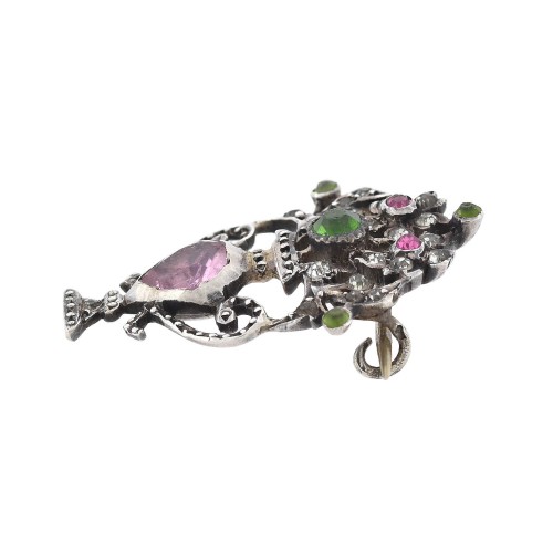 A stunning French paste pin from the Georgian (ca1750) era that perfectly showcases the giardinetto design! This lovely piece is crafted in sterling silver, and forms the shape of a beautiful vase filled with French paste “flowers.” Resting at the ends of curved wirework “stems,” the gorgeous crystals create a colorful array and include clear, green and pink paste hues. Each faceted stone has a closed back and rests in a collet setting, catching the light beautifully with every turn. Two curved handles lined with fine beadwork can be found on either side of the vase, adding a wonderful eye-catching appeal, and a large pear-shaped pink French Paste stone is set at the center. Finishing the design are delicate cutouts found throughout the floral arrangement and vase, adding a soft feminine touch and airiness to the design. On the back is the original c-catch clasp which has two small stamps, possibly of French origin. A wonderful and unique gemstone pin, this gorgeous piece would make a perfect addition to any collection!