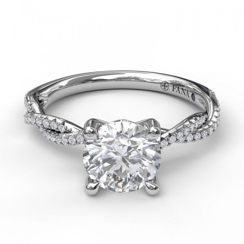 Wondrous waves of gold and diamonds interlace to enhance the center stone of this dreamy engagement ring. This alternating diamond twist engagement ring can be special ordered in any finger size, in Platinum, 18KT & 14KT gold and can be customized for any shape and size centerstone.