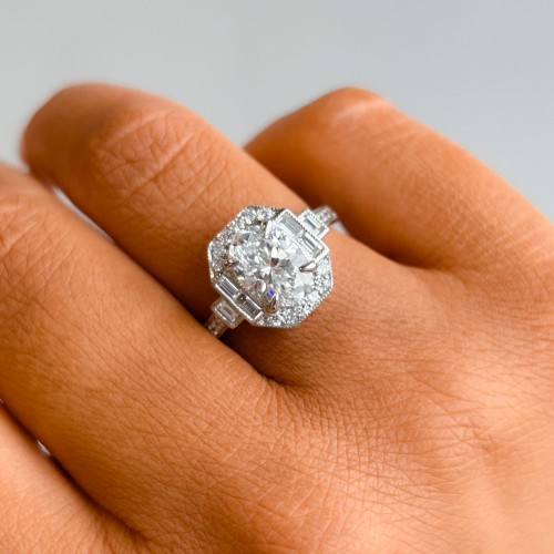 This stunning deco inspired diamond ring features a 1.50ct IGI Certified oval cut centre surrounded by round and baguette laboratory grown diamonds set in a milgrain edge bringing the total weight of this showstopping ring to 1.98ct.