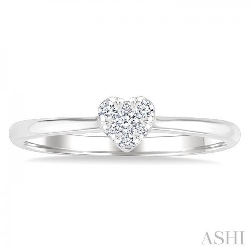 Ideal for any occasion, this Lovebright diamond fashion ring is a cherished addition to any jewelry collection. It features a striking heart-shaped center mount, embellished with a dazzling cluster of 7 invisible set round cut diamonds, 1 in the center and 6 surrounding it, creating a captivating sparkle. A plain gold reverse tapered shank elegantly emphasizes the heart shape center mount, highlighting its intricate design. The Lovebright diamond fashion ring is carved in a rhodium finish 10 karat white gold. The total diamond weight is 1/10 Ctw.