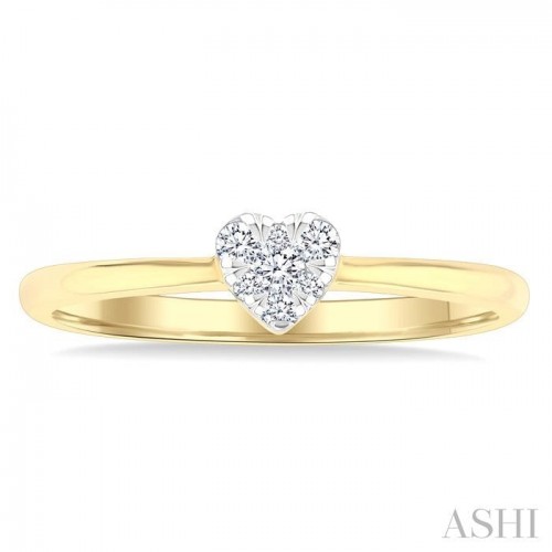 Ideal for any occasion, this Lovebright diamond fashion ring is a cherished addition to any jewelry collection. It features a striking heart-shaped center mount, embellished with a dazzling cluster of 7 invisible set round cut diamonds, 1 in the center and 6 surrounding it, creating a captivating sparkle. A plain gold reverse tapered shank elegantly emphasizes the heart shape center mount, highlighting its intricate design. The Lovebright diamond fashion ring is carved in 10 karat yellow gold. The total diamond weight is 1/10 Ctw.