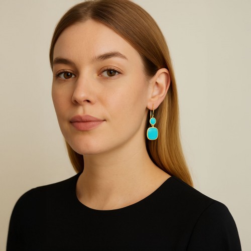 Crafted in 18K yellow gold, the Polished Rock Candy Small Dot and Rounded Square drop earrings features an elegant arrangement of turquoise stones set in yellow gold. With its bright blue color, this gorgeous pair is the perfect addition to any outfit.