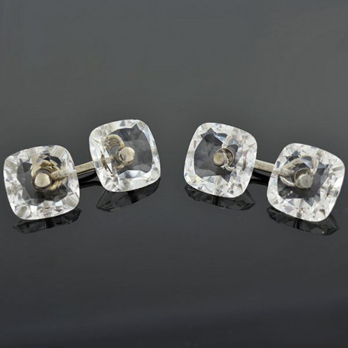 A very attractive 7-piece glass crystal cufflink set from the Art Deco (ca1930) era! This fabulous set is comprised of a pair of cufflinks and five shirt studs, a complete men’s set. The cufflinks are double sided and are separated by a silver-plated bar in between the cut glass crystal plaques. Each cufflink face is square in shape with faceted edges and softly rounded corners. The shirt studs carry a complimentary faceted crystal design to match the cufflinks, and come in two sizes, including two larger and three smaller studs. The shirt studs are marked “HICKOK” on the bar. Designed to look like rock quartz crystal, this fabulous set looks like the real thing. The wonderful ensemble has a simple, classic design and would look fantastic worn by a distinguished gentleman!