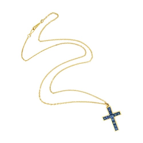 A beautiful sapphire cross pendant necklace from the Late Victorian (ca1900s)era! Crafted in 18k yellow gold, the pendant is lined with 10 square step cut sapphires, and one rectangular cut sapphire. The deep, rich blue sapphires are channel set and weigh approximately 2.25ctw combined. At the top of the cross is a complementary gold bail and matching 18k cable chain. The chain secures with a small push clasp.The simple design and delicate size of the pendant make this a perfect everyday piece!