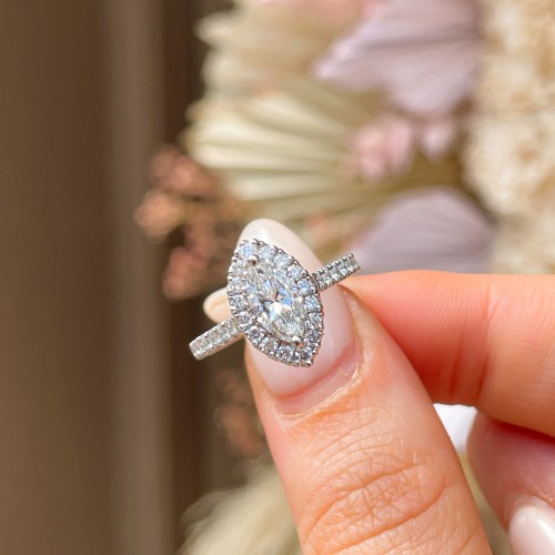 Lia is the Most Beautiful Marquise Halo Set with a 0.71ct IGI Certified Laboratory Grown Diamond. This is Supported by Castle Set Diamond Shoulders on a Platinum Ring.