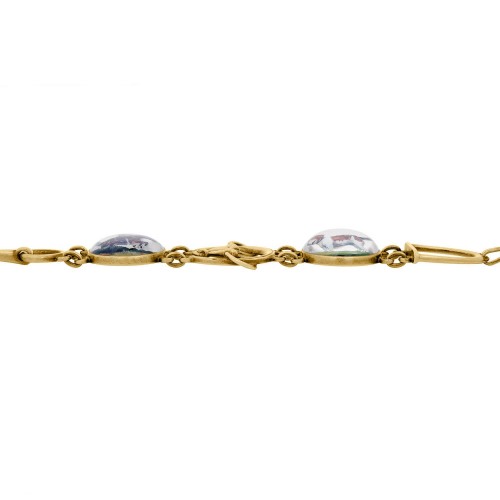 A beautiful reverse carved crystal bracelet from the Art Deco (ca1920) era by the wellknown company MARCUS & CO.! Made of 14kt yellow gold, the bracelet is decorated with three Essex crystal cabochons, featuring the head of a fox, a hunting dog, and a man on a jumping horse, all of which rest on a shimmery mother of pearl background. The painted carvings are highly detailed, including the animals’ fur and facial features and the rider’s apparel. The bezel set crystals are connected to the surrounding links, which are modeled off of a horse’s tack and saddle equipment including a horseshoe, bit, and stirrup. On the reverse side of one of the crystal bezels is stamped “14K”, “MARCUS & CO.”, and “PAT.SEPT.1924”. The bracelet is secured by a simple spring ring clasp. An amazing example of the era’s work by Marcus & Co., this bracelet would be perfect for the equestrian enthusiast or any antique jewelry collection!