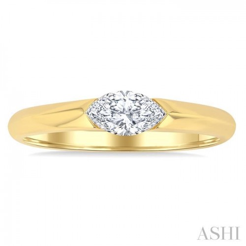 Simple but pretty, this striking diamond solitaire fashion ring creates a lasting impression. It features a fancy half bezel-set 1/3 Ctw marquise cut diamond solitaire center stone, stylishly placed in a horizontal east-west layout, offering the ring a unique and contemporary aesthetic. The alluring pear cut diamond radiates brilliance from every angle, perfectly complemented by the sleek and modern design of the plain gold knife-edge shank, with its sharp and defined edges. The diamond solitaire fashion ring is designed in a polished finish 14 karat yellow gold. Total diamond weight is 1/3 Ctw.