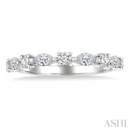 This simple but attractive diamond fashion band adds a modern flair to any collection. The combination of marquise and round cut diamonds provides a unique sparkle, making it a versatile piece for both everyday wear and special occasions. The band features an alternating row of diamonds that create a striking, asymmetrical look. 4 prong east-west set marquise cut diamonds alternate with 5 pave set round cut diamonds, enhancing the visual appeal with their distinctive shapes and arrangements. The diamond fashion band is carved in a polished rhodium finish 14 karat white gold. Total diamond weight is 5/8 Ctw.