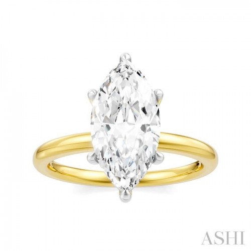 Take your love to the next level and step into an everlasting relationship, sealed with this enchanting semi-mount diamond engagement ring. attractively crafted, this ring features a captivating prong-raised marquise-shape center mount delicately poised on a sleek, plain gold shank. As a semi-mount ring, the center mount is left vacant for a stone of your choice that reflects your unique style and suits your budget. This should be a marquise cut diamond ranging from 1.65 Ctw to 2.35 Ctw. Pre-decorated in the gallery region of the ring are 14 split prong set round cut diamonds. The semi-mount diamond engagement ring is framed in a rhodium finish 14 karat yellow and white gold. The total diamond weight is 1/10 Ctw.