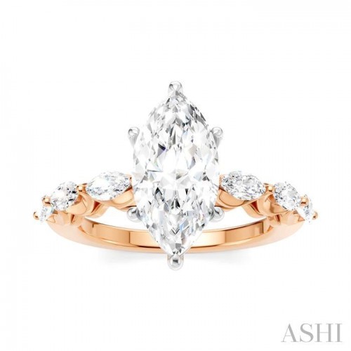 Begin a new chapter of your love with this exquisite semi-mount diamond engagement ring that offers a captivating blend of beauty and sophistication. It also gives you the freedom to choose a desired center stone, letting you the opportunity to create a ring that is as unique as your love, and ensuring that every glance at the hand serves as a reminder of the special bond you share. The ring features a 14 karat white gold prong-raised marquise-shaped center mount, where a marquise cut diamond ranging between 1.65 Ctw to 2.35 Ctw of your choice gets installed. Beautifying the shank are pre-decorated, 3 each fancy prong set marquise cut diamonds on either side, total 6 diamonds. 14 microscopic split prong set round cut diamonds embellish the gallery region. The semi-mount engagement ring is crafted in a rhodium finish 14 karat rose and white gold. The total diamond weight is 3/4 Ctw.