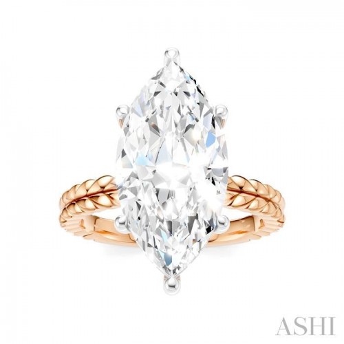 The word Akari means ‘light’ or ‘illumination’ in Japanese, which perfectly embodies this semi-mount diamond engagement ring’s radiant beauty. As a semi-mount ring it offers the flexibility to choose a personalized center stone, reflecting your style. The ring features a striking 14 karat white gold marquise-shaped center mount, designed to hold a marquise cut center stone of your choice, ideally ranging between 4.50 Ctw to 5.50 Ctw. Highlighting this center stone are 20 pre-installed microscopic split prong set round cut diamonds. An intricate yellow gold wheat germ carved shank adds texture and sophistication to the semi-mount engagement ring, which is styled in a two-tone rhodium finish 14 karat rose and white gold. The total diamond weight is 1/8 Ctw.