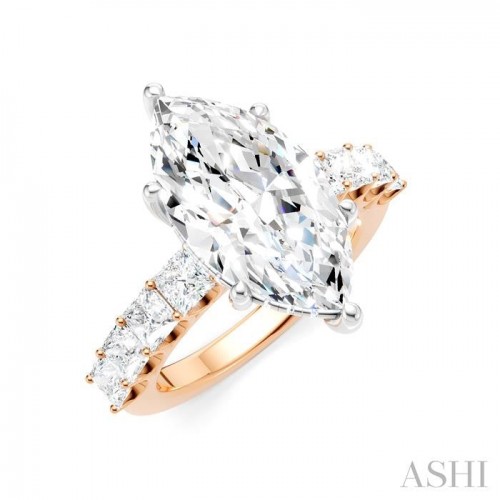 Make your love story unforgettable with this exquisite and meaningful semi-mount diamond engagement ring, which is more than just a piece of jewelry-it is a symbol of your love. At its heart lies a prong-raised marquise-shaped center mount, where a center stone of your choice, a marquise cut diamond ranging between 3.65 Ctw to 4.50 Ctw is installed. The beauty does not stop here, as the shank comes pre-embellished with 4 each fancy prong set 1/6 Ctw princess cut diamonds on either side. As you admire the ring from every angle, you will notice 10 sparkling microscopic split prong set round cut diamonds adorning the gallery region. The semi-mount engagement ring is molded in a rhodium finish 14 karat rose and white gold. The total diamond weight is 1 1/3 Ctw.