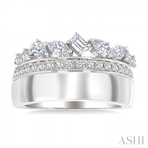 A mesmerizing fusion of geometric brilliance and fluid elegance, this mixed diamond cut fashion ring is a contemporary masterpiece. Styled in a luminous polished rhodium finish 14 karat white gold, its sleek structure is subtly adorned, allowing the diamonds to take center stage. A row of 17 prong set round cut diamonds graces the top rim, adding a soft, radiant sparkle. Above this, an exquisite array of mixed diamond cuts creates a striking contrast, offering a dynamic play of light and shape. At the center, a tilting prong set emerald cut diamond exudes sophistication, its step-cut facets reflecting a refined glow. A marquise and pear cut diamond each, set at an angle, along with two round cut diamonds, introduce graceful asymmetry on either side of the emerald cut, completing the dazzling composition. Total diamond weight is 3/4 Ctw.