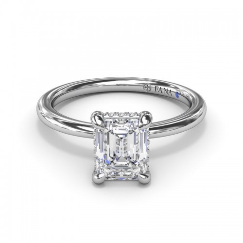 This modest solitaire diamond engagement ring features a bezel-set, sleek band, and peek a boo diamond for a whimsical look. This design can be customized based on stone shape and metal preference.
