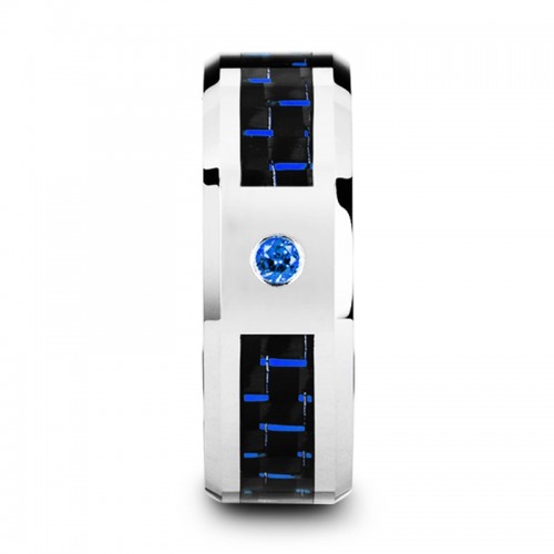Tungsten Carbide Ring with Black and Blue Carbon Fiber and Blue Sapphire Setting with Bevels