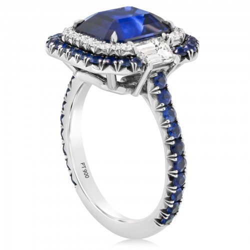 Platinum sapphire and diamond ring featuring one emerald cut ceylon sapphire weighing 4.02 ct. The ring also features round cut sapphires weighing 1.07 ctw, two trapezoid cut diamonds weighing .75 ctw, and round brilliant cut diamonds weighing .16 ctw. Size 6.5 in stock. Designed by Omi Prive.