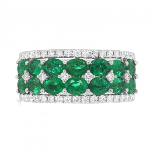 18K white gold emerald and diamond ring from the Reis-Nichols Collection. The ring features 14 oval cut emeralds weighing 2.31 ctw and 40 brilliant round diamonds weighing .45 ctw. Size 6.5 in stock. Special order sizes also available. Pricing may vary with size.