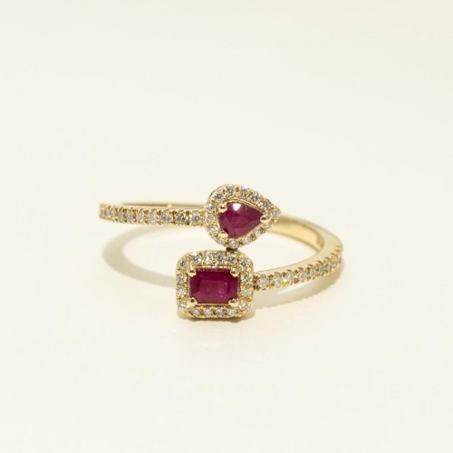 A glimmering ruby pairs perfectly with sparkling diamonds and 14kt yellow gold in this stunning ring.