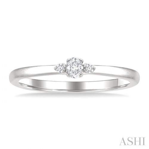 Graceful and understated, this 3-stone diamond fashion ring from the Petite Collection blends classic charm with modern minimalism. A shimmering oval cut diamond takes center stage, flanked by two small round cut diamonds that enhance its brilliance. Each stone is prong hand set to capture light from every angle, creating a delicate focal point. The sleek, plain gold band offers a refined backdrop, allowing the trio of diamonds to shine with subtle elegance. Designed in rhodium finish 10 karat white gold, the diamond fashion ring is a timeless accent perfect for everyday wear or thoughtful gifting. Total diamond weight is 1/10 Ctw.