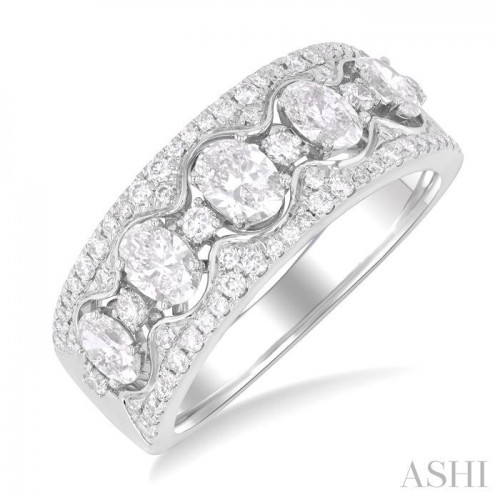 This wide diamond fashion band is a dazzling display of elegance and luxury. The ring top showcases a curvy open-window center, where five prong set oval cut diamonds are nestled gracefully within the curved grooves. The center three oval diamonds, each 1/5 Ctw, are flanked by a 1/6 Ctw oval diamond on either end. Separating these oval diamonds are 6 prong set round cut diamonds, adding a touch of brilliance. A border of 62 pave set round cut diamonds, 31 on either side, enhances the ring’s radiant sparkle. Styled in a polished rhodium finish 14 karat white gold, this wide fashion band is a stunning statement of sophistication. Total diamond weight is 1 1/5 Ctw.