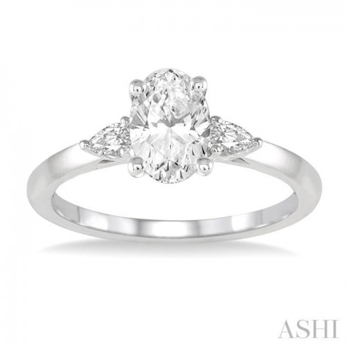 A simple but captivating diamond ladies engagement ring, this makes for a sophisticated choice. It features an attractive centerpiece, complimented by a plain gold shank. Highlighting the centerpiece is a 1/3 Ctw prong set oval cut center stone on a raised middle mount, flanked by a lower mount on either side. Each of the lower mounts is embellished with a prong set pear cut diamond. The engagement ring is framed in a polished rhodium finish 14 karat white gold. Total diamond weight is 1/2 Ctw.