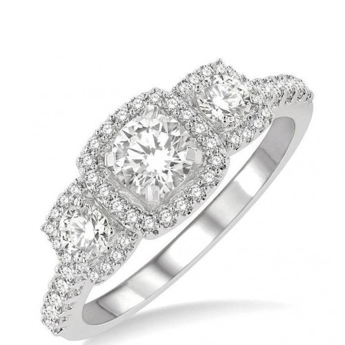 Simple and sleek diamond ladies engagement rings are being sought after for their elegance. This diamond engagement ring is one such piece. It features a plain white gold shank, with a striking triple diamond centerpiece, placed on raised mounts. The center mount is slightly higher than the mounts flanking it, with a prong set 1/2 ct oval cut diamond nestled on it. Embellishing the lower mounts is a prong set pear cut diamond each, flanking the center mount. The engagement ring is styled in a polished rhodium finish 14 karat white gold. Total diamond weight is 3/4 ctw.