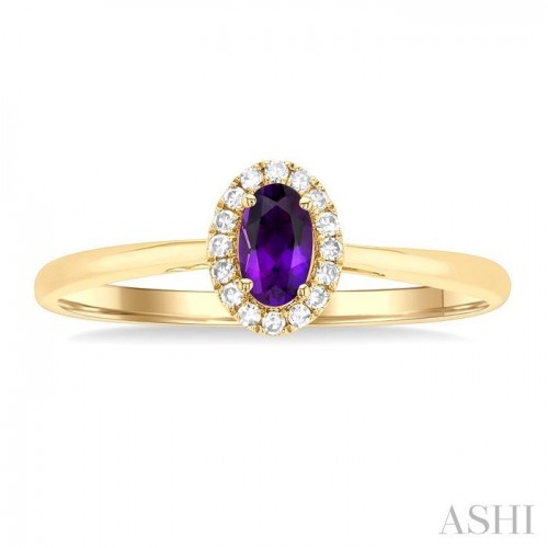A beautiful Semi-Precious fashion ring, this makes for a quick buy. It is simple but elegant, which is why it easily pleases the eye. The ring features a oval shape center mount that houses a 5×3 MM amethyst, haloed by single cut diamonds. There are a total of 16 micro wall set single cut diamonds surrounding the center stone. The Semi-Precious fashion ring is molded in a polished finish 10 karat yellow gold. Total diamond weight is 1/20 Ctw.