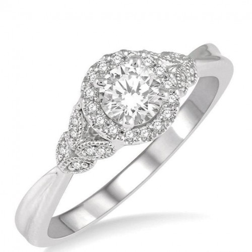 A sleek and stylish semi-mount diamond engagement ring, this makes for an easy choice. It features a prong raised oval shape center mount, where a center stone of your choice goes. This should be an oval cut center stone, ranging from 0.25 ctw to 0.35 ctw. Pre-embellishing the split criss cross shank, is a total of 48 micro wall set round cut diamonds. A bezel set round cut diamond each, adorns the center front and back of the gallery. 7 each, total 14, micro wall set round cut diamonds decorate the arch at the front and back in the gallery region. The semi-mount engagement ring is styled in a polished rhodium finish 14 karat white gold. Total diamond weight is 1/4 ctw.