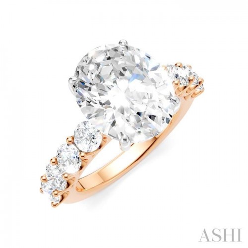 A charming semi-mount diamond engagement ring, this makes your proposal even more romantic with your personal touch added to it. The ring features a prong-raised oval-shaped center mount, ready for a center stone of your choice. This should be a oval cut diamond in the range of 4.50 Ctw to 5.50 Ctw. The shank comes pre-embellished with 4 each, 1/10 Ctw round cut diamonds on either side, adding to the elegance of the ring. Also, pre-adorning the gallery region are 16 microscopic split prong set round cut diamonds. A rhodium finished 14 karat rose and white gold offers luminous sophistication to the semi-mount diamond engagement ring. The total diamond weight is 1 1/3 Ctw.