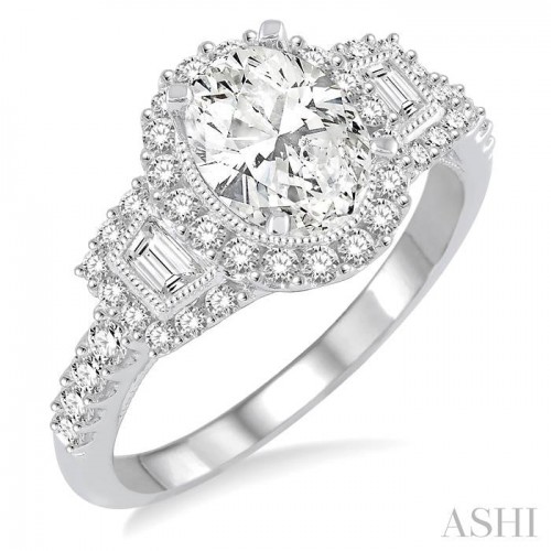 True love is eternal symbolize this statement with this charming diamond semi-mount ring. Styled in gleaming 14 karat white gold this milgrain finish ring showcases 2 gorgeous paired fancy set trapezoid diamonds embellished and bounded by sparkling 50 prong set round cut diamonds, framing one oval shapes and flow down the shank in a brilliant row. The center of this ring awaits for your choice of center stone ranging from 1.00 carat to 1.50 carat. Total diamond weight is 1 Ctw
