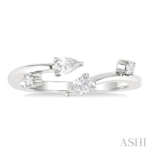 Meticulously crafted, this diamond open fashion ring is an ideal choice for those seeking a unique and sophisticated addition to their jewelry collection. The captivating ring showcases a graceful open bypass design, featuring two exquisite 1/10 Ctw each pear cut diamonds, prong set to perfection at each open end. Adding to its charm, a prong set round cut diamond each is strategically placed adjacent to each other, at a certain distance from the pear cut diamonds, enhancing the fluidity of the bypass motif. The diamond open fashion ring is designed in a polished rhodium finish 14 karat white gold, blending contemporary flair with timeless elegance. Total diamond weight is 1/4 Ctw.