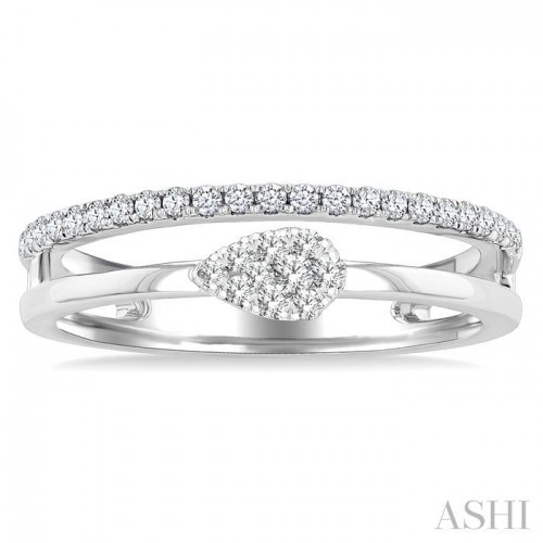 Jewelry in the Lovebright collection displays immense beauty and elegance, with its brilliantly sparkling diamond setting, intricate craftsmanship and gorgeous designs. This ladies ring is one of them. It features a split shank, forming a twin ring top. While one ring is lined with diamonds, the other has a pear center mount on a plain gold shank. The ring with the diamond row is embellished with 23 micro wall set round cut diamonds. Decorating the pear center mount of the other ring is 10 invisible set round cut diamonds. The ring is styled in 10 karat white gold. Total diamond weight is 1/4 Ctw.
