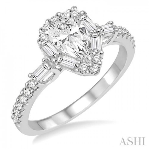 Tell her that she is the love of your life with this enticing diamond engagement ring. Styled in 14 karat lustrous white gold this ring showcases a 1/2 Ct pear shaped diamond at the center. Brilliant 26 baguette and round cut diamonds, beautifully encompasses the center in a pear shape and embellishes the shank with a sparkling row of diamonds. Diamonds are perfectly set in prong and pave settings. Total diamond weight is 1 Ctw.
