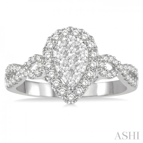 This stylish diamond lovebright ring will make her the envy of all the onlookers. Styled in 14 karat shining white gold this pear shape ring showcases a set of 10 invisible set round cut diamonds at the center. Brilliant 51 pave set round cut diamonds, beautifully encompass the center in pear design and embellishes the shank with a row of dazzling diamonds. Total diamond weight is 3/4 Ctw.