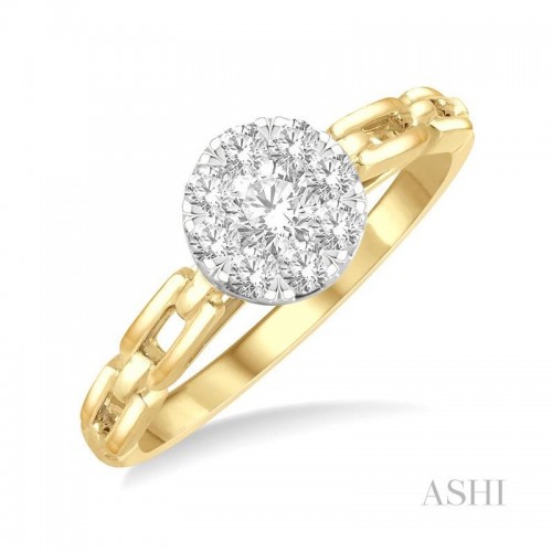 Styled in yellow gold, which is back in fashion again, this Lovebright lattice diamond engagement ring offers aesthetic appeal. It features a pear shaped center mount, with a yellow gold border. The white gold middle, which apart from offering a two-tone look is decorated with 10 invisible set round cut diamonds. 15 micro wall set round cut diamonds embellish the yellow gold border surrounding the white gold pear shaped middle. A chiseled shank adds to the beauty of the ring. It displays an intricately detailed row of marquise and round mounts alternating each other. There are 2 each round and marquise mounts on either side, a total of 4 round and 4 marquise mounts. A bezel set round cut diamond each adorns the round mounts, while 2 each pave set round cut diamonds embellish the marquise mounts, a total of 4 and 8 diamonds respectively. The ring is fashioned in 14 karat yellow and white gold. Total diamond weight is 1/3 ctw.