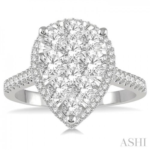 This sparkling Lovebright diamond cluster ring features a pear shape center, adding a showy finish to it. The glamorous ring comprises of a pear shape head that is adorned with 11 invisible set round cut diamonds. A pear shape lower borders this head and is encrusted with 49 prong set round cut diamonds. The shoulder and the upper shank are also embellished with prong set round cut diamonds. A contrasting rose gold gallery, with 2 bezel set round cut diamonds, offers an eye-catching look. The Lovebright ring is crafted in 14 karat White and Rose gold. Total diamond weight is 1 Ctw.