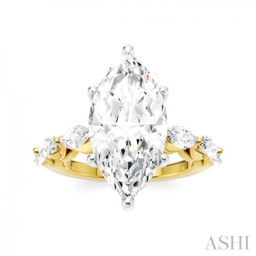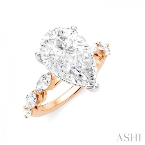 Begin a new chapter of your love with this exquisite semi-mount diamond engagement ring that offers a captivating blend of beauty and sophistication. It also gives you the freedom to choose a desired center stone, letting you the opportunity to create a ring that is as unique as your love, and ensuring that every glance at the hand serves as a reminder of the special bond you share. The ring features a 14 karat white gold prong-raised pear-shaped center mount, where a pear cut diamond ranging between 3.65 Ctw to 4.50 Ctw of your choice gets installed. Beautifying the shank are pre-decorated, 3 each fancy prong set marquise cut diamonds on either side, total 6 diamonds. 20 microscopic split prong set round cut diamonds embellish the gallery region. The semi-mount engagement ring is crafted in a rhodium finish 14 karat rose and white gold. The total diamond weight is 1 Ctw.