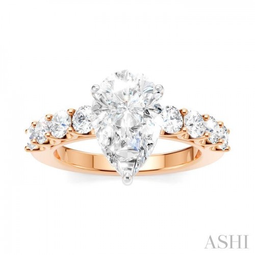 A charming semi-mount diamond engagement ring, this makes your proposal even more romantic with your personal touch added to it. The ring features a prong-raised pear-shaped center mount, ready for a center stone of your choice. This should be a pear cut diamond in the range of 1.65 Ctw to 2.35 Ctw. The shank comes pre-embellished with 4 each, 1/6 Ctw round cut diamonds on either side, adding to the elegance of the ring. Also, pre-adorning the gallery region are 16 microscopic split prong set round cut diamonds. A rhodium finished 14 karat rose and white gold offers luminous sophistication to the semi-mount diamond engagement ring. The total diamond weight is 7/8 Ctw.