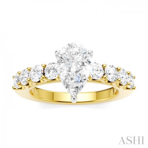 A charming semi-mount diamond engagement ring, this makes your proposal even more romantic with your personal touch added to it. The ring features a prong-raised pear-shaped center mount, ready for a center stone of your choice. This should be a pear cut diamond in the range of 0.85 Ctw to 1.20 Ctw. The shank comes pre-embellished with 4 each, 1/6 Ctw round cut diamonds on either side, adding to the elegance of the ring. Also, pre-adorning the gallery region are 10 microscopic split prong set round cut diamonds. A rhodium finished 14 karat yellow and white gold offers luminous sophistication to the semi-mount diamond engagement ring. The total diamond weight is 7/8 Ctw.