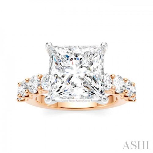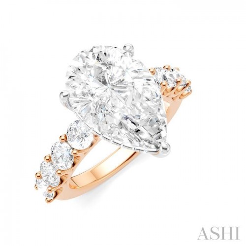 A charming semi-mount diamond engagement ring, this makes your proposal even more romantic with your personal touch added to it. The ring features a prong-raised pear-shaped center mount, ready for a center stone of your choice. This should be a pear cut diamond in the range of 4.50 Ctw to 5.50 Ctw. The shank comes pre-embellished with 4 each, 1/6 Ctw round cut diamonds on either side, adding to the elegance of the ring. Also, pre-adorning the gallery region are 22 microscopic split prong set round cut diamonds. A rhodium finished 14 karat rose and white gold offers luminous sophistication to the semi-mount diamond engagement ring. The total diamond weight is 1 1/3 Ctw.