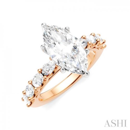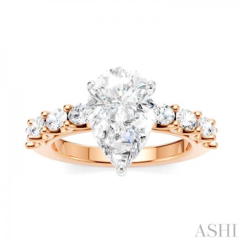 Celebrate your love story with this exquisite and meaningful semi-mount diamond engagement ring, destined to be treasured for a lifetime. Skillfully crafted with attention to detail, the ring features at its center, a 14 karat white gold prong-raised pear-shaped mount designed to hold a center stone of your choice. This must be an pear cut diamond in the range of 1.65 Ctw to 2.35 Ctw. Complementing the center mount are pre-adorned 4 each fancy prong set 1/10 Ctw oval cut diamonds on either side of the shank, adding a touch of glamour and refinement to the ring. Enhancing the gallery region are 10 microscopic split prong set round cut diamonds. The semi-mount engagement ring is fashioned in a rhodium finish 14 karat rose and white gold. The total diamond weight is 7/8 Ctw.